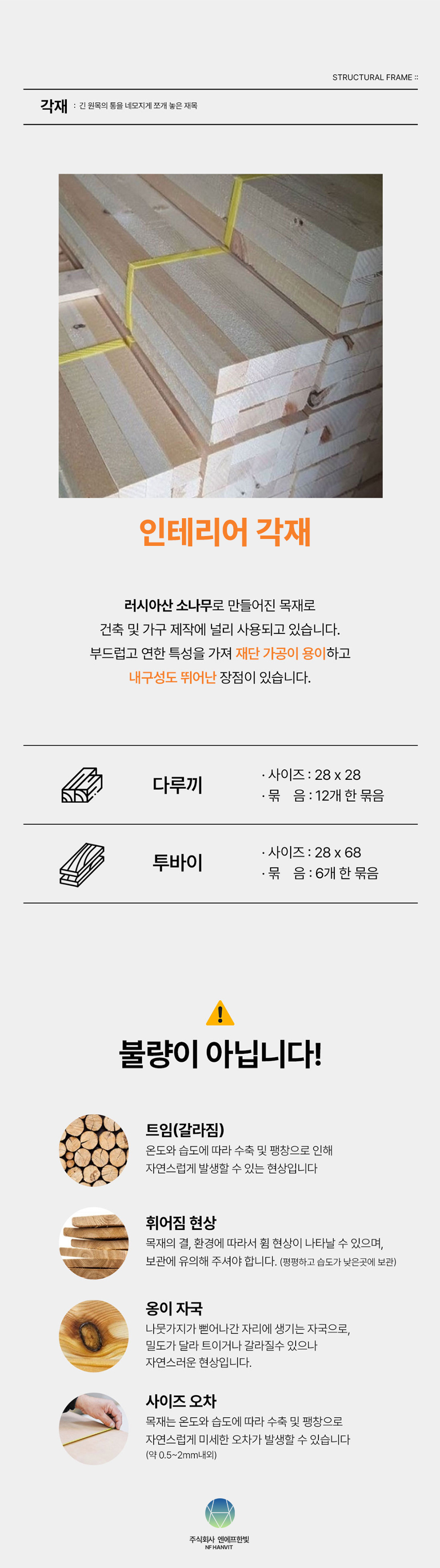 * 미송각재의 제제-유통-보관환경상, 어쩔수없이 종종 발생되는 곰팡이나 휨으로 인한 반품교환은 상당히 어려운 면을 널리 양해부탁드립니다.